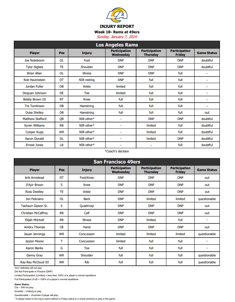 In Woche 18 geht es für die Rams nach San Francisco zu den 49ers. Das Division-Duell beinhaltet nur noch bedingt Spannung: Für die 49ers ist die Regular Season quasi abgehakt, die Männer aus San Francisco stehen an #1 der NFC und haben diesen Spot unabhängig vom Ergebnis am Sonntag sicher. Die Rams indes konnten sich in Woche 17 ebenfalls ein Playoff Ticket sichern. Das Seeding der Rams ist allerdings noch offen, bei einem Sieg hätte man den sechsten Seed sicher, bei einer Niederlage könnte man auf den siebten Seed rutschen, sollten die Packers gegen die Bears gewinnen. Für beide Teams scheint jedoch zu gelten, dass die Minimierung von Verletzungen oberste Priorität hat. So werden unter anderem Top-Spieler wie Matthew Stafford, Aaron Donald, Kyren Williams, Brock Purdy, oder Christian McCaffrey geschont. Wir sehen daher ein Duell der Backups.