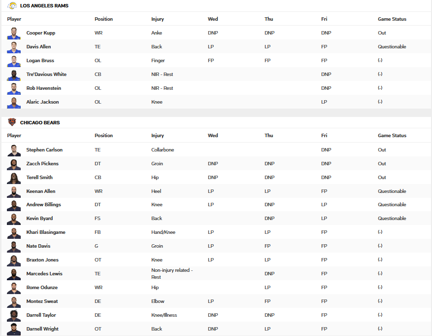 Leider ein Dauerbrenner und doch müssen wir euch Spieltag für Spieltag damit langweilen, dieses Matchup zu wiederholen. Das Verletzungspech ist selbstverständlich weiterhin gegeben, allerdings konnte man schon leichte Verbesserungen im Spiel gegen die 49ers erkennen. Da die Laufverteidigung der Bears Schwächen aufweist, gehe ich davon aus, dass McVay wieder viel über Kyren Williams laufen lassen wird, um somit auch ein bisschen Druck von der O-Line zu nehmen, die Pocket halten zu müssen.