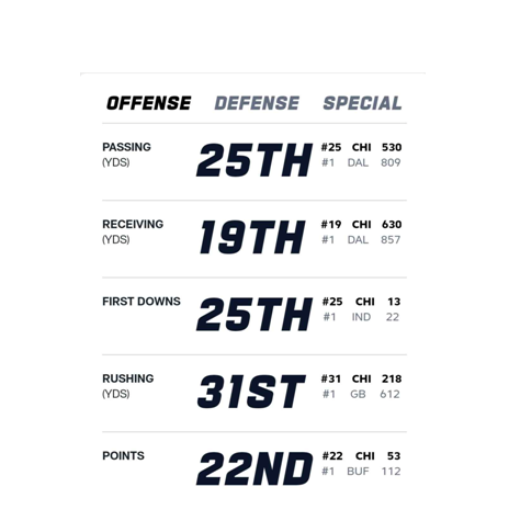 Im Spiel gegen die Titans konnte die Defense aus Chicago glänzen, denn mit 2 Pick-Six (1x Int, 1x geblockter Punt) haben sie ihrem Team den Sieg ermöglicht. Cornberback Jaylon Johnson durfte schon 2 Interceptions bejubeln und mit insgesamt 6 Turnovers sind sie in der Liga ganz vorne mit dabei. Ihre D-Line rund um Linebacker T.J Edwards macht in den bisherigen Spielen ebenfalls einen starken Eindruck, forcen die gegnerische Offensive immer wieder zu überhasteten Aktionen. Insgesamt lässt die Bears Defense 286,7 Yards pro Spiel zu. Ein Traum, angesichts der Tatsache, dass die Rams in dieser Statistik mit 425,7 Yards/Game die rote Laterne tragen...