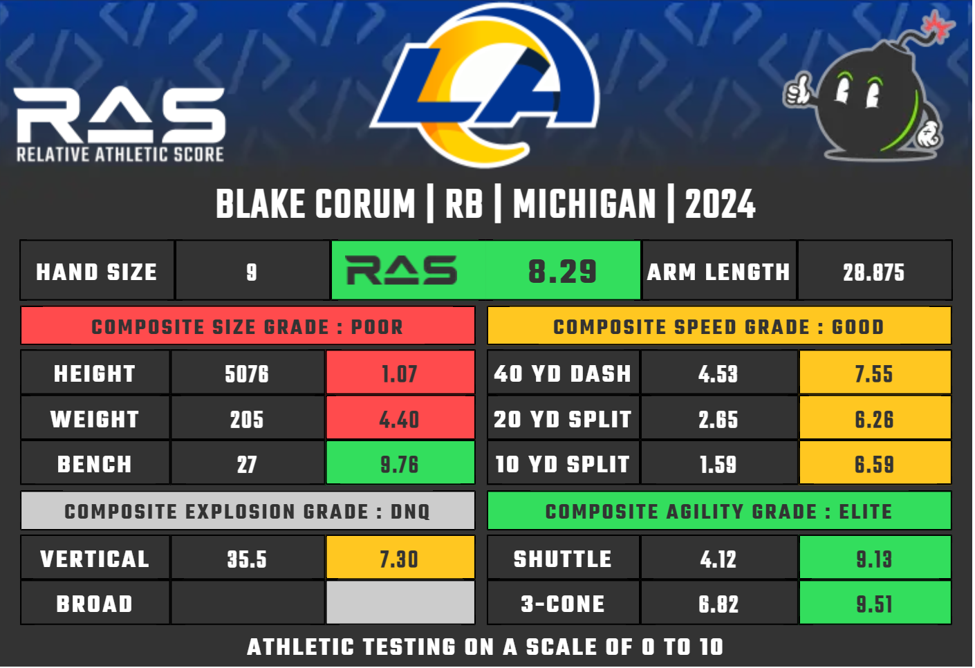 Einen Rams Draft, ohne das ein Runningback ausgewählt wird, wird es wohl nicht geben, zumindest so lange der Headcoach Sean McVay heißt. Mit Kyren Williams erlebten die Rams eine Wiederauferstehung des Runninggames. Der hohe Workload und die Verletzungen von Williams waren mit Sicherheit nicht unwichtig bei der Entscheidung, Blake Corum aus Michigan auszuwählen. Mit Corum holen sich die Rams einen Spieler vom amtierenden College Championship Team. Seit 2021 war er aus dem Michigan Wolverines-Backfield nicht mehr wegzudenken. 2022 war er der klare Starter, wurde aber zu Mitte der Saison durch einen Meniskusriss, Innenbandriss und eine Knochenprellung im linken Knie ausgebremst. Aufgrund desen entschied sich Corum, nicht in den NFL Draft 2023 zu gehen und ein weiteres Jahr für Michigan zu spielen und trug sich als Teil des Meisterschaftsteam in die Geschichtsbücher ein.