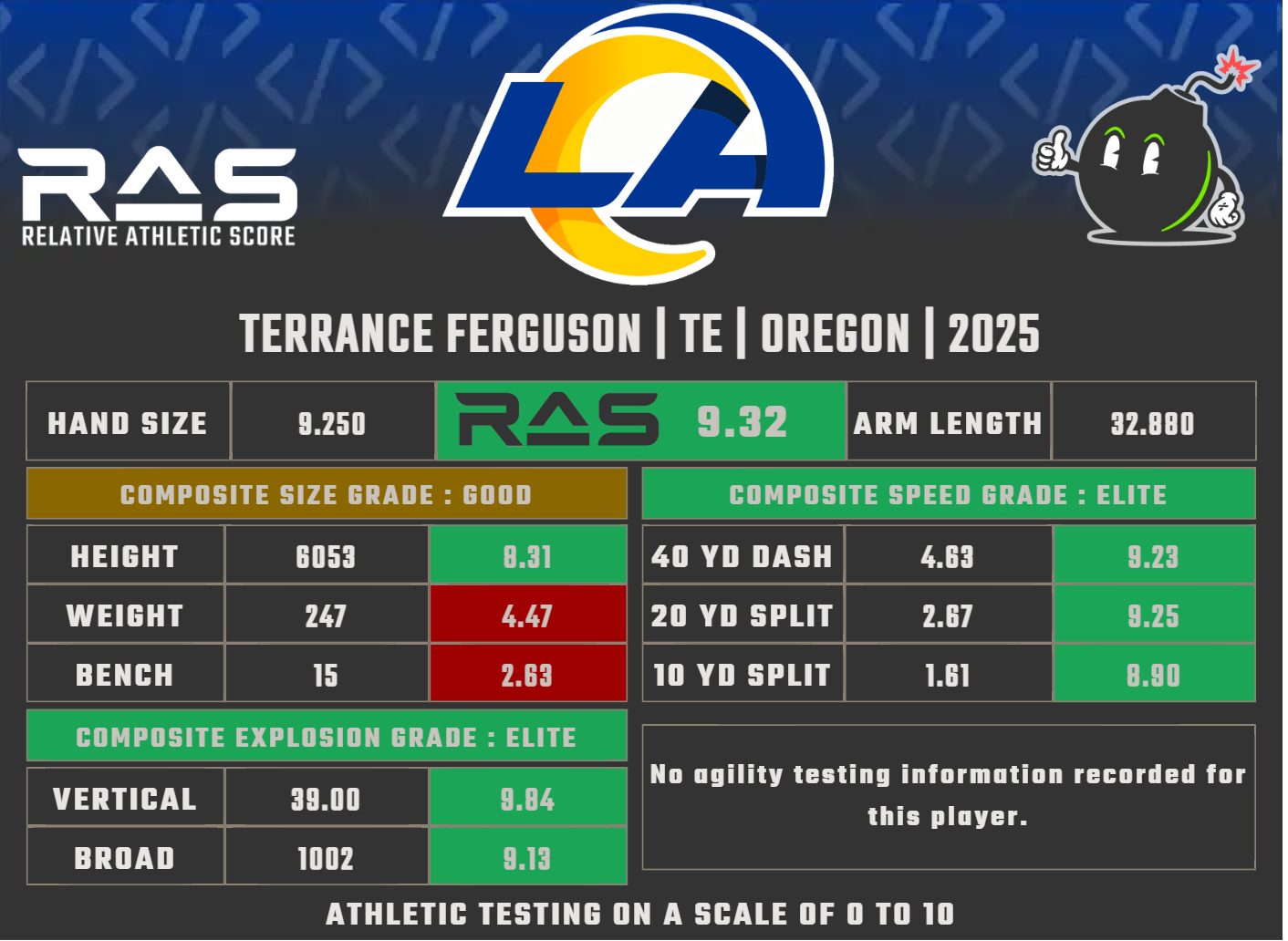 Die Spatzen pfiffen es bereits im Vorfeld des NFL Drafts 2025 von den Dächern, das die Rams einen Move auf Tight End machen werden. Anders als von vielen vermutet einen Push in der ersten Runde zu machen, tradeten die Rams ihren First Round Pick mit den Atlanta Falcons und durften so erst in der zweiten Runde ihren ersten Pick im diesjährigen Draft machen. Die Wahl fiel auf Terrance Ferguson von Oregon. Ferguson war ein vielseitiger Tight End in Oregon, die mit einem Spread Schema in ihrer Offense spielen. Bei den Oregon Ducks spielte er hauptsächlich aus dem Slot oder als Inline/Wing (oft als Blocker eingesetzt, bevor er sich als Anspielstation frei lief). Seine letzte Saison bei den Ducks brachte nicht die gewünschte Explosion und Höhen, die man sich von ihm gewünscht hätte, dennoch war er immer ein verlässliches Ziel. Er gilt als ein athletischer Routenläufer mit guten Catching Skills. Vor allem seine Fähigkeiten Yards after Catch zu erzeugen, überzeugen bei ihm. 2024 sorgten 25,6 Prozent seiner Catches für einen Raumgewinn von 20 Yards oder mehr. Sein Blocking reicht grundsätzlich aus, um gegnerische Defender aus dem Konzept zu bringen er muss aber an seiner Technik arbeiten, um hier konstanter und effektiver zu sein.