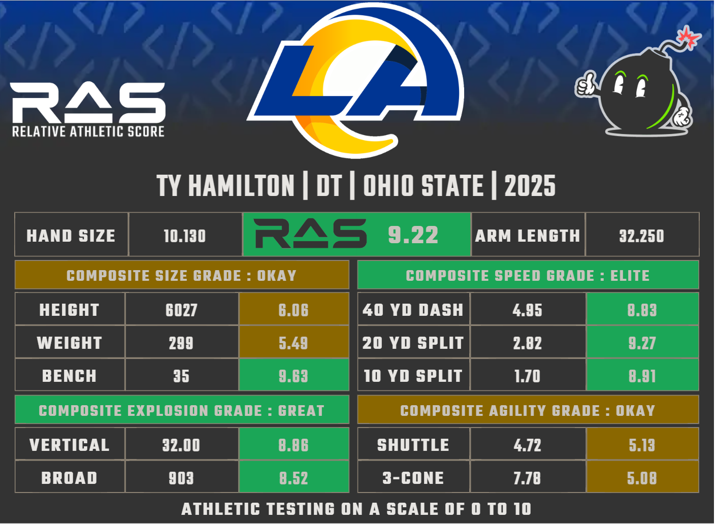 Ty Hamilton tritt in die Fußstapfen seines großen Bruders. Dieser spielte ebenfalls an der Ohio State und gehört seit 2020 zum NFL Kader der Jacksonville Jaguars. Seine geduldige und stetige Entwicklung über Einsätze im Specialteam über Rotationseinsätze bis hin zu einer Schlüsselrolle als Stammspieler bei den Buckeyes spricht für ihn. Mit seiner anfänglichen Schnelligkeit und einem guten Gespür für Blocks erzeugt er Druck und sorgt für Unruhe auf der generischen Seite. Seinen Pass Rush muss er auf jeden Fall noch verbessern.